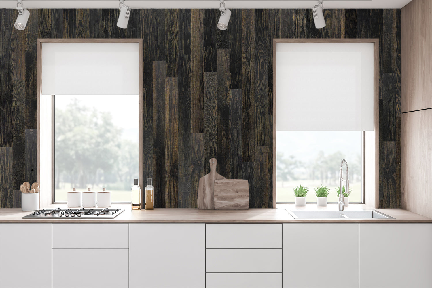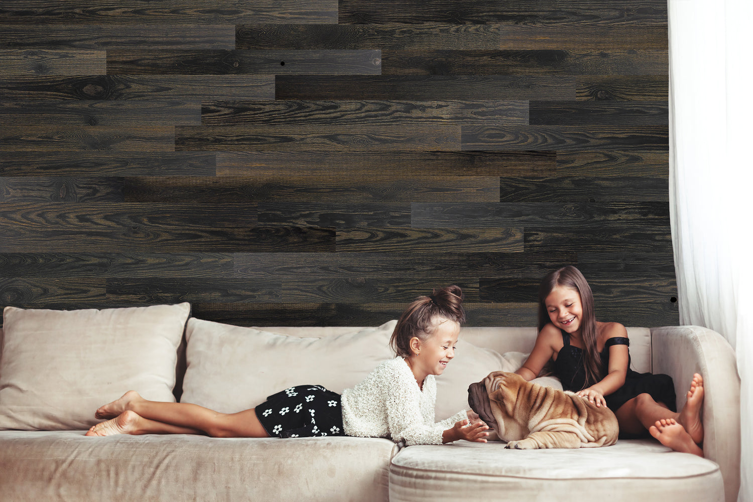 Blackened pine wood makes a bold statement in any space, commanding attention with its striking color and unique texture. This peel and stick jet-black Barnwood style wall application will provide a modern dramatic design element to your walls, ceilings and backsplashes.